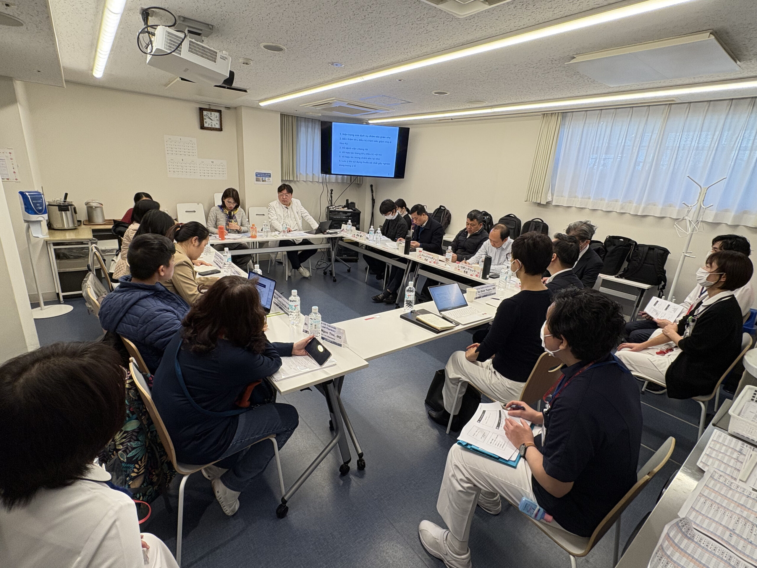 2025年12月10日(水)、ベトナムで緩和医療の臨床研究に携わる医師6名、看護師4名が当院を訪問されました。当日は越川院長より、地域における緩和ケアの取り組みについて講演を行いました。在宅医療システムや緩和ケア病棟の特徴などについて活発な質疑応答が交わされ、関係者の高い関心と熱意が感じられる、有意義な視察となりました。