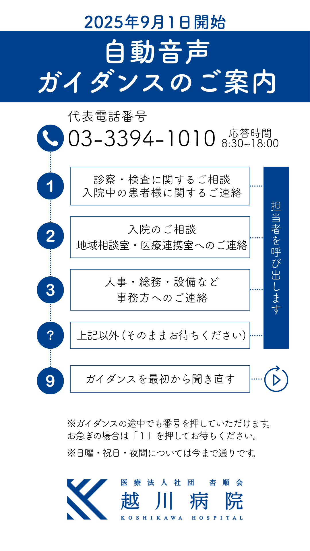 当院では2025年9月1日(月)より、病院代表電話に自動音声案内を導入します。患者様・関係者様各位への円滑なご案内を目的としておりますので、ご理解のほど、よろしくお願い申し上げます。